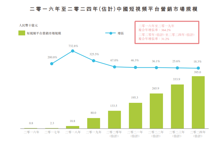 根据艾瑞咨询报告在中国短视频平台投放广告产生的收入由二零 一六年的人民币8亿元增加至二零一九年的人民币800亿 元,复合年增长率364.2%, 并预期由二零二零年的人民币1,335亿元进一步增加至二零二四年的人民币3,950亿元,复合年增长率为31.2%。