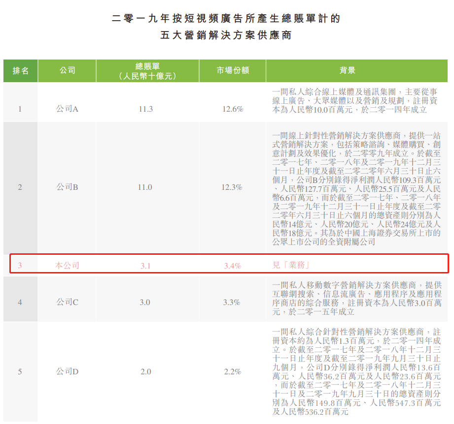 原文如下:“于二零一七年、二零一八年及二零一九年以及截至二零二零 年六月三十日止六个月,我们透过供货商A的内容分发平台产生的总账单占我们的总 账单总额约37.7%、85.2%、87.1%及84.8%。我们主要透过抖音、抖音火山版、西瓜视频0.及快手等中国顶尖网络平台提供在线营销解决方案。”