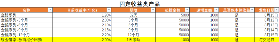 随着近期市场利率下降,固定收益类产品预期收益有所下滑,目前报价回购产品固定年化2%收益且T+1可取,性价比较高。