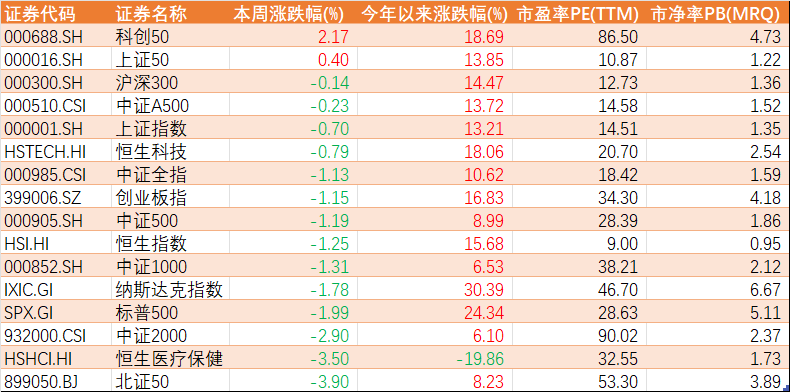 本周A股主要指数大多下跌,仅科创50和上证50两头上涨,北证50跌幅较大。从市场结构来看,中小微市值股票调整幅度略大,机构重仓权重股相对稳定。预计年底前权重股将维稳指数,继续关注主题性投资机会。