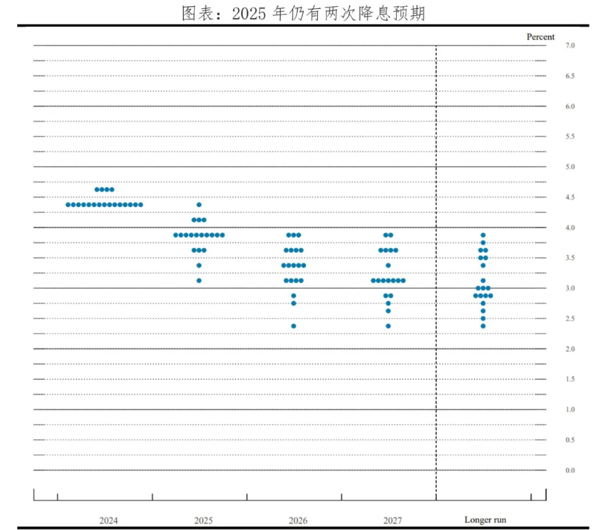 同时,美联储对经济预期乐观,上调2025年GDP、通胀和利率中值,下调失业率预测。根据点阵图显示,2025年仍有50bp降息指引,对应联邦基金利率中值3.9%。