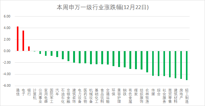 上涨的行业为通信、电子和银行,其中通信和电子涨幅超过3%。轻工制造、房地产、建筑材料和商贸零售等行业领跌,下跌超过4%。板块方面,AI和国产替代相关的科技成长板块表现强势,本周后半周连续大涨三天。