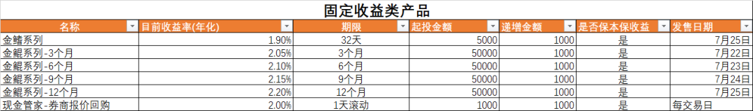 随着近期市场利率下降,固定收益类产品预期收益有所下滑,目前报价回购产品年化2%收益且T+1可取,性价比较高。