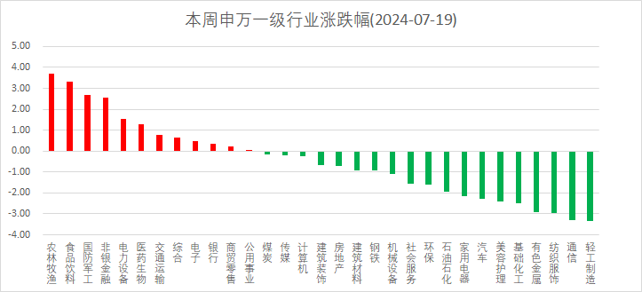 从行业来看,31个申万一级行业中,有12个行业上涨,其中农林牧渔、食品饮料、国防军工和非银金融涨幅居前,涨幅均超过了2%;轻工制造、通信、纺织服装等行业下跌达到了3%。最近一个月中,因中报业绩预告不达预期,煤炭行业回撤明显。