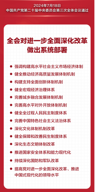 本周中共二十届三中全会于7月15日至18日在北京举行。会议审议通过了《中共中央关于进一步全面深化改革、推进中国式现代化的决定》。全会紧紧围绕推进中国式现代化这一主题谋划和部署改革,书写了继续把改革推向前进的时代新篇。随着各部门领会学习党的最新精神,后续各领域部门负责人也将对具体执行细节进行发布。