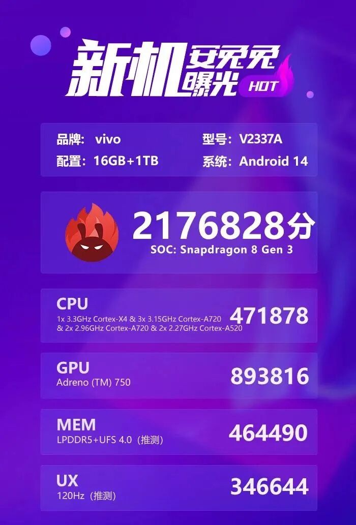 如上图所见,安兔兔曝光了vivo X Fold3 Pro的跑分,可以看到这款新机搭载骁龙8 Gen3处理器,提供16GB内存+1TB存储空间,最终综合跑分2176828分,整体性能释放和常规骁龙8 Gen3旗舰机型相当。
