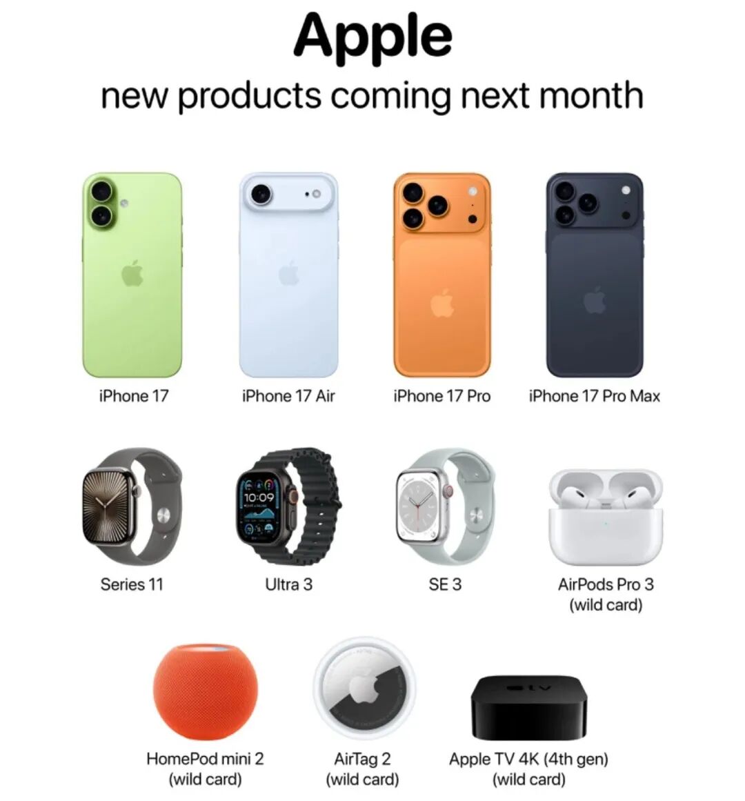 首先是发布时间,据外媒报道,德国手机供应商内部消息称苹果秋季发布会或定在9月9日(北京时间对应9月10日凌晨),届时除了会发布iPhone 17系列、新款Apple Watch外,传闻可能还有AirPods Pro3、手表、音响等等,不知道大家最关注哪款?