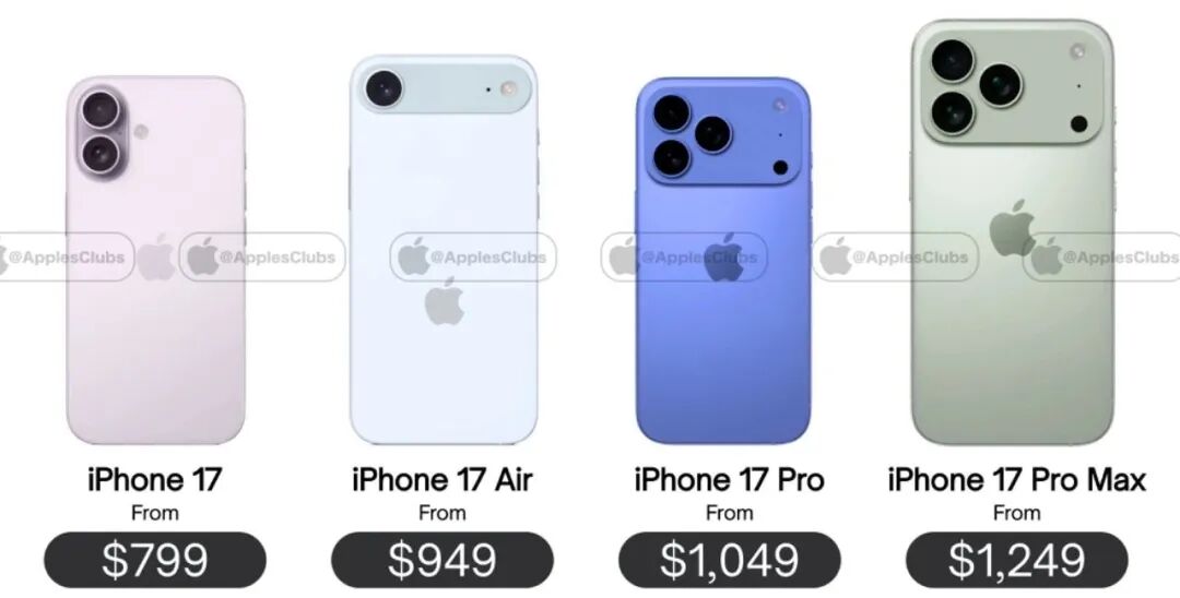 爆料iPhone 17或为799美元起,iPhone 17 Air或为949美元起,iPhone 17 Pro或为1049美元起,iPhone 17 Pro Max或为1249美元起。