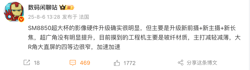 影像硬件升级确实很明显,但主要是升级新前摄+新主摄+新长焦,超广角没有明显提升,目前摸到的工程机主要是玻纤材质,主打减轻减薄,采用的一块国产大R角大直屏、四等边很窄等等。