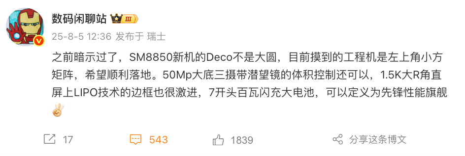 首先是一加这边,据爆料达人数码闲聊站消息,一加的骁龙8 Elite2新旗舰(下文先以一加15代称,最终命名以发布为准)将不再采用大圆后置模组,目前工程机是左上角小方矩阵,具体后置50MP大底三摄有潜望长焦镜头,还将搭载OPPO的自主影像品牌(Find X8 Ultra首发的「LUMO凝光影像」)。