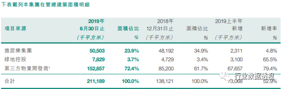 雅生活服务的盈利模式在物业公司行业中是属于比较独特的,而这也使我对这家公司产生了更为浓厚的兴趣。绿地金融分别透过其全资附属公司绿地海外及宁波绿璡投资管理有限公司持有雅生活服务合计200,000,000股,占比15%,而绿地金融又是绿地集团有限公司的全资子公司,所以绿地集团并没有直接设立自己的物业公司,而是通过投资入股的方式加入到对手的阵容中。而绿地集团的土地土地开发实力也是有目共睹的,过去五年绿地集团的销售面积均排名前六。其实这也不失为一个好的策略,既然打不过,那就加入他们吧。而对于雅生活服务而言,不用过度依赖母公司的土地储备,只要做好物业管理本职工作,利用大股东的优势来增加管理面积,所以造就了雅生活服务的高效盈利能力,以25%的净利率排名行业榜首。可以说,这样的方式对于绿地和雅生活服务而言,是个双赢的格局。根据雅生活服务2019年中报来看,第三方及绿地的合约建筑面积增速均保持了55%以上的增速,在管建筑面积分别保持65%及80%的增速,这样的增速着实让人大开眼界啊。又查询了2019年1-11月房地产企业的拿地面积,碧桂园以4000万平的面积排名第一,而绿地控股和雅居乐合计拿下3900万平,实力规模几乎与碧桂园持平。这些对于雅生活服务而言,后续的物业管理面积以及业绩成长打下了较好的基础。