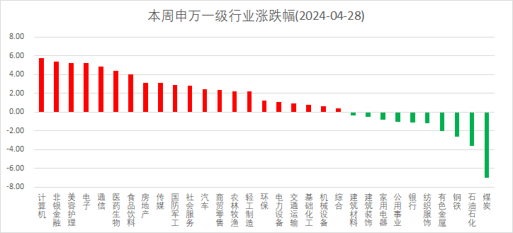 从申万一级行业来看,计算机、电子和通信涨幅居前,券商板块受到“国务院推动头部券商做优做强”影响涨幅较大,此外医药板块也呈现出一定触底反弹态势。前期表现较好的低估值高分红板块有不同程度下跌,煤炭、石油石化领跌,显示资金风格有一定切换。