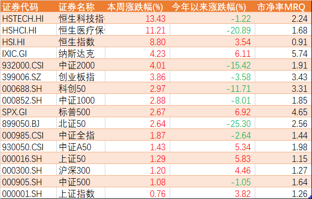 本周A股主要指数均有不同程度上涨,其中港股涨幅较为明显,恒生科技上涨13.43%、恒生医疗上涨11.21%,涨幅均超过10%;A股中证2000、创业板指和科创50等成长风格指数上涨较多,上证50、沪深300等价值型指数涨幅较小,市场上涨个股比例超过73%,接近半数个股涨幅超过4%,呈现较强的赚钱效应。