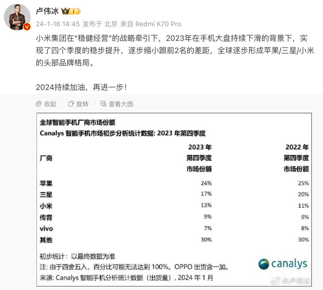 如上图所见,卢伟冰引用Canalys发布的2023Q4全球数据称:“小米2023年在手机大盘持续下滑的背景下,实现了四个季度的稳步提升,逐步缩小跟前2名的差距,全球逐步形成苹果/三星/小米的头部品牌格局。”。