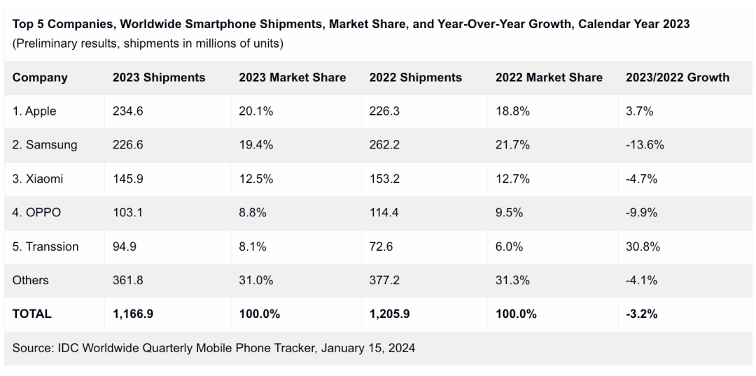 而无论是Canalys发布的2023Q4全球数据,还是另一家机构IDC更新的2023年全年(1-12月)全球智能手机市场出货量数据,前三名均一致❶苹果 ❷三星 ❸小米,后者的全年数据还是苹果近十几年来首次年度数据超越三星登顶第一。具体份额上虽然有差异,但这两年TOP3一直是这三家。回看小米近几年在全球手机市场的排名,也一直稳居全球第三,你觉得未来有几率全球第二吗?国产品牌里你最看好哪家发展?