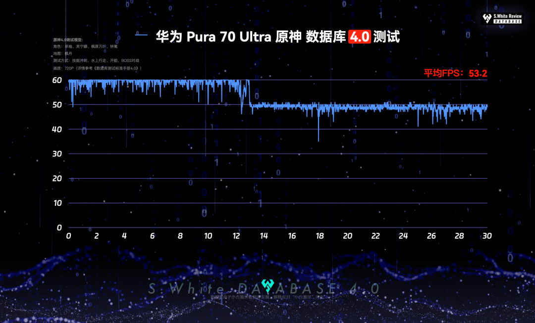 《原神》数据库4.0模型测试:平均帧率53.2 FPS,功耗6.4W,机身最高温度48.2℃。(画质最高672P,而数据库4.0模型标准720P)