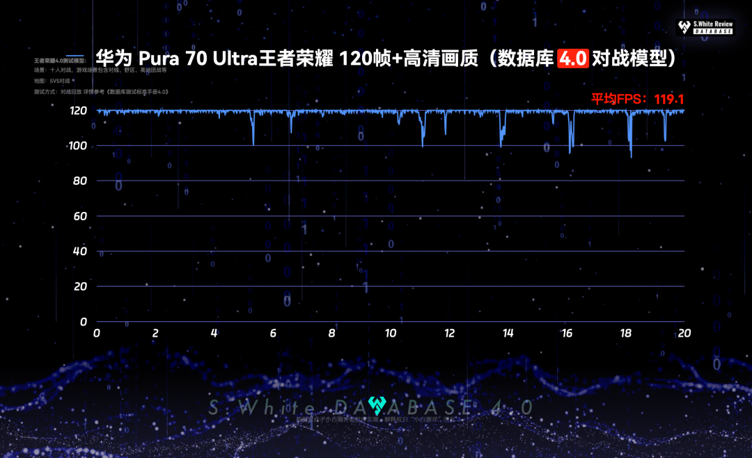 《王者荣耀》实测华为Pura 70 Ultra表现:60帧+极致画质平均帧率59.7 FPS,功耗3W,机身最高温度38.7℃(帧率一条直线);120帧+高清画质平均帧率119.1 FPS,功耗5.1W,机身最高45.2℃。(此处使用数据库4.0对战模型测试。需要注意:数据库4.0模型标准测试条件为120帧+极致画质,但Pura 70 Ultra最高支持120帧+高清画质)