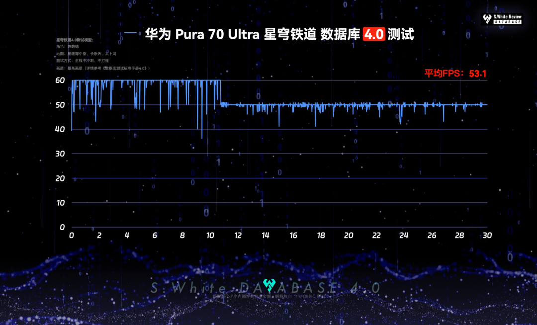 《星穹铁道》数据库4.0模型测试:平均帧率53.1 FPS,功耗6.2W,机身最高温度47.2℃。(星穹铁道默认插帧、且不能关闭,移动视角能感知到延迟和画面的不连贯)