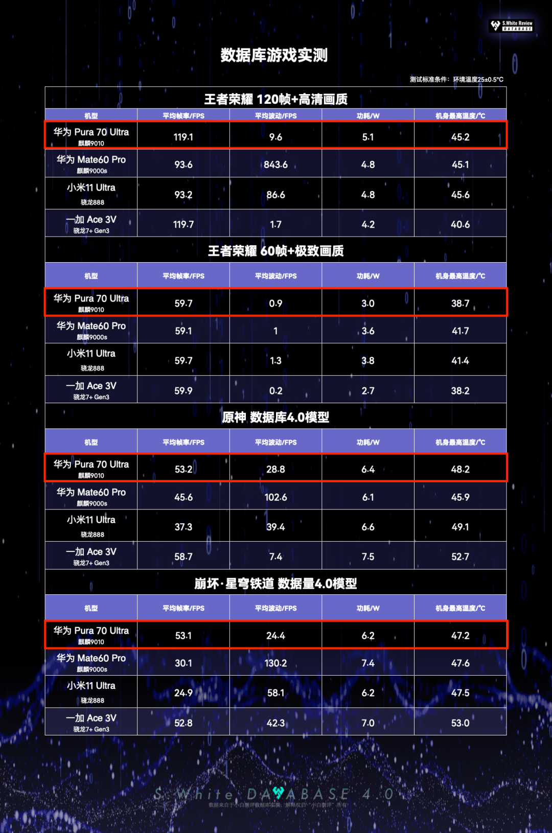 小白测评数据库4.0标准条件为环境温25℃±0.5℃,屏幕亮度350nit,声音75dB,性能模式。以上数据基于华为 Pura 70 Ultra 测试时最新版系统测试,版本号HarmonyOS4.2.0.137(SP1C00E135R3P5)。