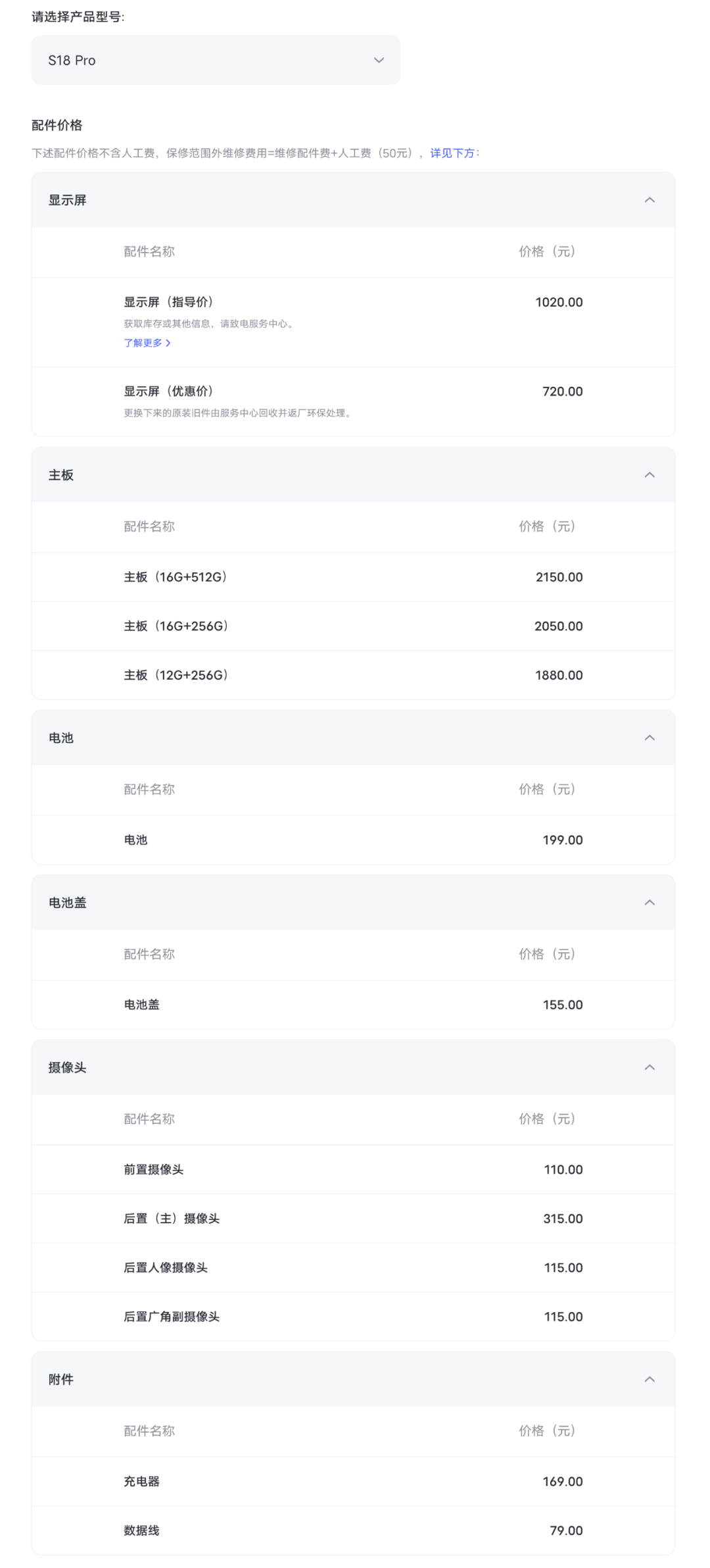另一边随着正式发售,官网也更新了S18 Pro的维修配件价格,保外维修时显示屏指导价为1020元、显示屏优惠价为720元,主板从1880-2150元不等,电池199元,电池盖155元,前置摄像头110元,后置主摄315元,后置人像115元,后置副摄115元。