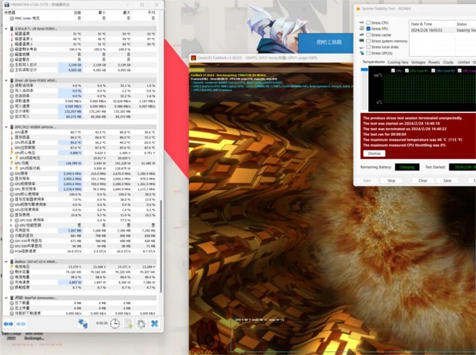 AIDA64 FPU+Furmark甜甜圈双烤测试20分钟,CPU功耗可以稳定在45W,温度达到100℃,GPU功耗稳定在140W左右,全程拉满,温度90℃,还是非常不错的。由于显卡DB的存在,双烤下功耗可以动态分配,最终加起来可以稳定在宣传的185W的性能输出,比上一代暗影精灵9高了足足15W,性能释放更加优秀,表现可圈可点。