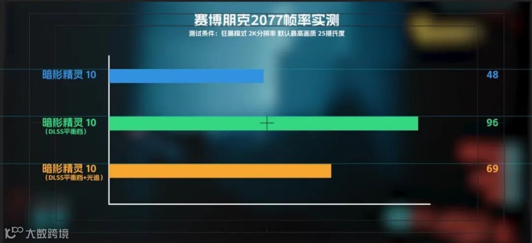 经典的大型3A游戏《赛博朋克2077》2K最高画质下,不开光追和DLSS的情况下,平均48帧;开启DLSS后,帧数提高一倍来到了96帧;同时开启DLSS和光追后,帧率也有69帧,也超过了60帧的基准线,玩起来丝滑流畅,游戏体验优秀。