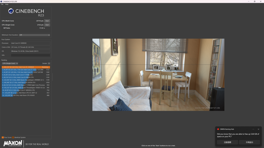 Cinebench R23单次测试,单核2154,多核25710,表现优秀。