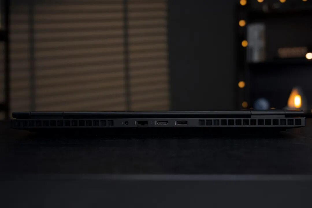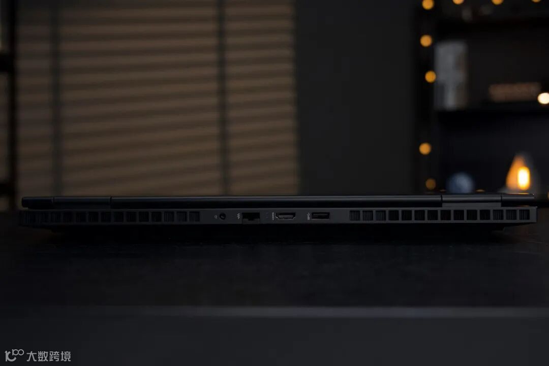 侧面的接口也是非常丰富,左边是两个雷电4和耳机孔,这个价位段双雷电4的接口确实比较少见,不论是拓展多屏幕显示还是外接各种外设,双雷电 4 都能满足需求,值得点赞。右边是一个3.2 的A口,后面集成了电源、网口、HDMI2.1和一个3.2的A口,总体接口也是非常丰富了。