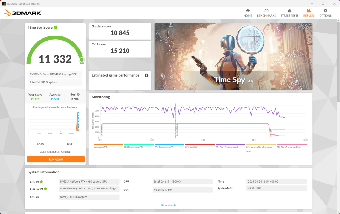 3DMark Time Spy综合评分11332分,显卡得分接近11000分,CPU也有15000多分。