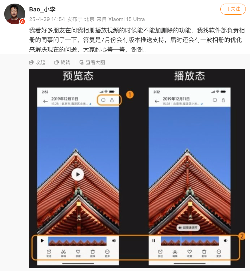 。最近几个月小米15 Ultra发布以来网上也有不少用户提供反馈或者建议,希望相机体验可以更好。昨日我们注意到小米相机部副总经理苗雷发长文整理了近期网友提到的问题并进行了回复。