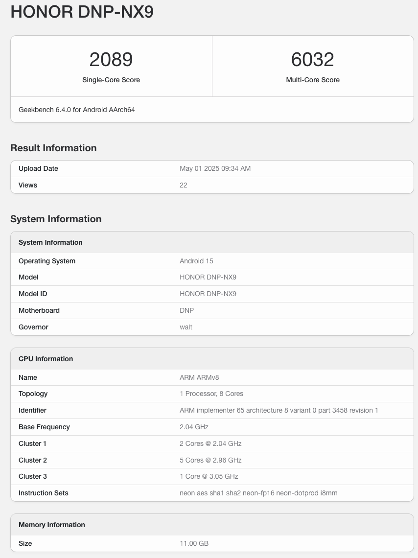 如上图所见,荣耀有一款型号为DNP-NX9的新机现身Geekbench 6后台,12GB运存,单核跑分2089,多核成绩6032,搭载的处理器CPU规格为1*3.05GHz+5*2.96GHz+2*2.04GHz,有博主爆料称其对应荣耀400 Pro,搭载的是骁龙8 Gen3降频版。