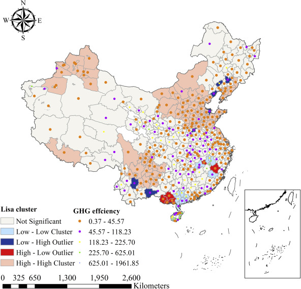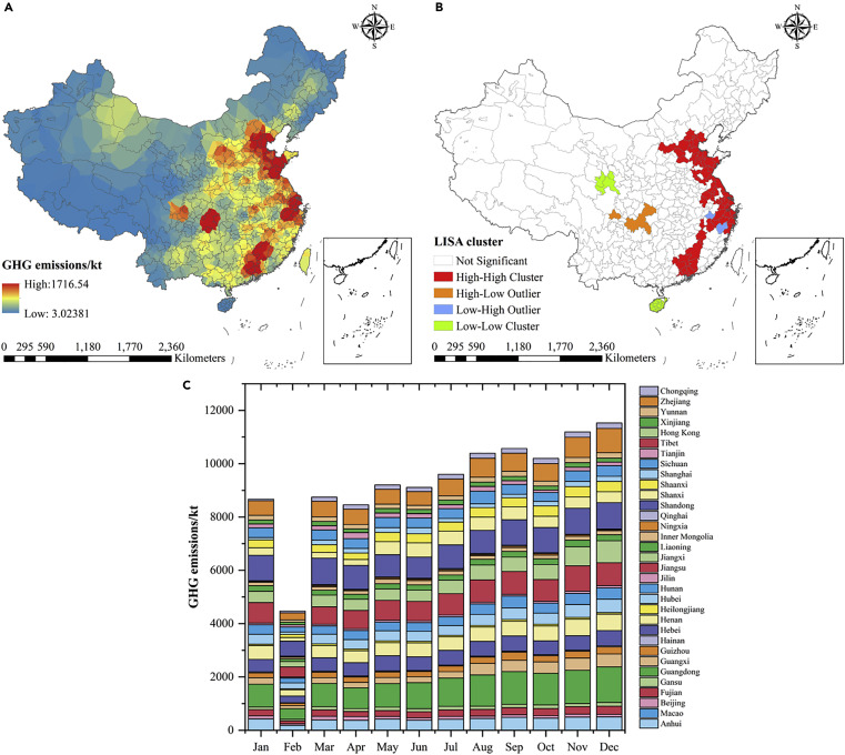 区域尺度上的高温室气体排放量出现在发达省份,如山东和江苏,以及依赖矿产资源的省份,如新疆和内蒙古。相反,区域温室气体排放量较低的省份主要是西部地区最不发达的省份,如青海、宁夏和甘肃。广州、重庆、上海和杭州是排放量排名前四的城市,占全国排放量的7.6%。值得注意的是,排放量排名前十的城市占总排放量的16.1%;这些城市位于中国经济发展的前沿。在这些城市中,临沂与其他城市的经济水平差距明显,但临沂位于长三角和京津唐经济圈的交汇点,2019年平均日货运量为4.0787亿吨,货运周转量为1,438.9亿吨公里。东北地区大部分区域被归类为排放冷点,但哈尔滨和长春相比周边城市是排放热点。