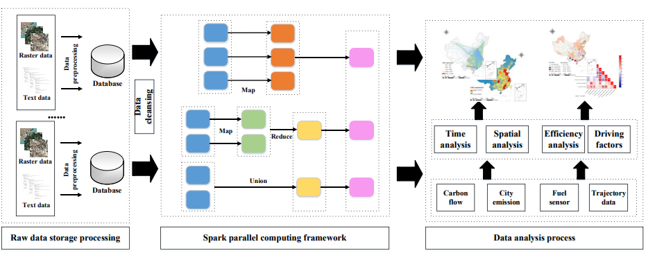 GPS用于实时定位,确定车辆行驶距离,通过发动机管理系统(EMS)传感器获取燃料消耗数据,信号收集频率为10秒。数据存储在数据库中,并经过预处理以提高计算性能。我们将时间分辨率设置为按月,空间分辨率为地级市。数据清洗后输入Spark 2.4并行框架,通过Map-Reduce模型高效计算地方温室气体排放和卡车燃料消耗。空间分析使用ArcMap 10.6,相关和回归分析使用SPSS 22.0,不确定性分析使用MATLAB 2018a。