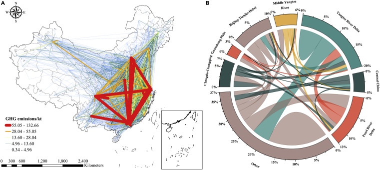 2019 年,中国物流运输产生的温室气体中约有 26.1%来自最终在不同省份或国外进行深加工或直接消费的商品。大多数与东部沿海省份消费相关的排放来自较贫穷的西部省份,西北地区通过提供碳密集但附加值低的产品支持发达省份的经济发展。