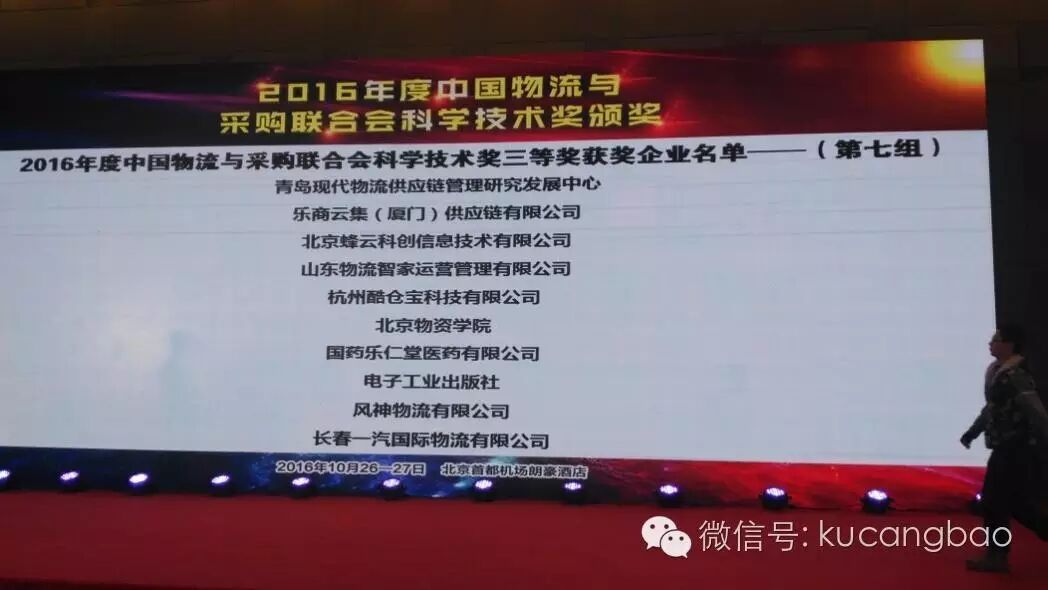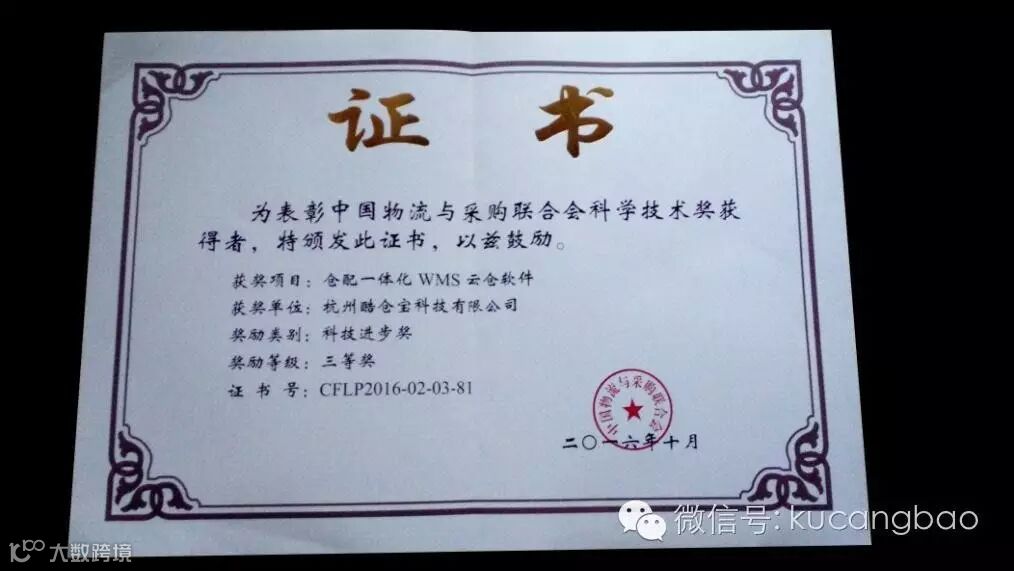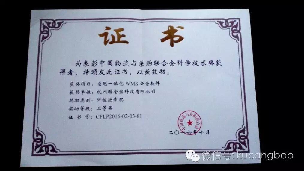 杭州酷仓宝凭借“仓配一体WMS云仓软件”项目,在众多参评项目中获得“2016年度科技进步奖”三等奖。