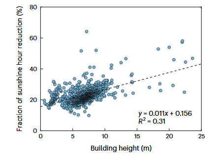 由于云层覆盖导致的阳光减少范围从20%到60%,其中西南部地区的减少幅度最低,东北部地区的减少幅度最大(补充图5)。寒冷气候(寒冷和极寒)区域的阳光相对减少最大,其次是潮湿地区(热湿、海洋和混合湿润)和干旱地区(热干和混合干燥)(补充图6)。虽然城市结构对阳光时数的影响不如云层覆盖显著,但仍减少了10%到40%的阳光时数(补充图7)。这些减少在城市化区域显示出相似的空间分布。我们观察到,城市的平均建筑高度(代表三维城市结构的指标)与建筑区内阳光时数的减少呈现直接关系(图3;y = 0.011x + 0.156,R² = 0.31,P < 0.05),突显了较高建筑物对阳光可获得性的遮挡效应。