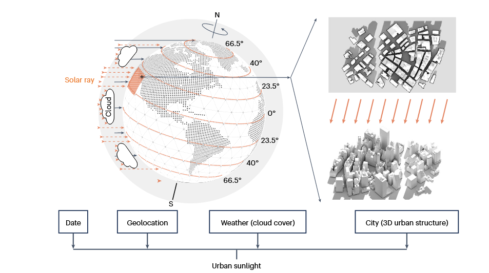 然而,现有关于城市阳光的研究大多局限于粗分辨率观测(例如气象卫星)或局部地面测量,云层和城市结构对阳光减少的具体影响尚不明确。在本文中,我们开发了一个概念框架,将自然日照时间、云层覆盖和三维(3D)城市结构整合起来,以模拟城市阳光照射情况。通过将该框架应用于美国1,353个拥有高分辨率光探测和测距(LiDAR)数据的城市,我们绘制了年度日照时长、自然阳光和城市阳光的时空模式,并定量评估了云层覆盖和城市结构对阳光减少的贡献。