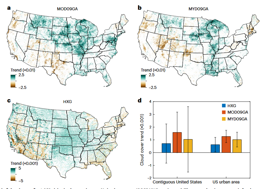 云层覆盖和城市结构的综合影响导致美国城市每年阳光时数减少了2,896小时,相当于121天的阳光损失。随着城市化进程的推进,更多的摩天大楼和增加的阴影效应预计将使这一损失继续恶化。此外,城市化可能加剧云层的形成,因为城市表面的加热将通过对流抬升湿空气促进水分聚集,并从周围更潮湿的农村地区刺激水分传输。来自Terra MODIS平台的MOD09GA和Aqua MODIS平台的MYD09GA卫星观测数据,以及国际卫星云气候学项目(ISCCP)的H系列像素级网格化(HXG)数据集,证实了云层覆盖总体上升的趋势(图4)。在美国本土地区,除西部地区(如俄勒冈州、加利福尼亚州、内华达州、犹他州、亚利桑那州和新墨西哥州)外,云层覆盖显示出HXG、MOD09GA和MYD09GA的年均增长趋势分别为0.71 × 10⁻³ yr⁻¹、1.59 × 10⁻³ yr⁻¹和1.04 × 10⁻³ yr⁻¹。城市区域的云层覆盖增长趋势相似,但标准差较小。