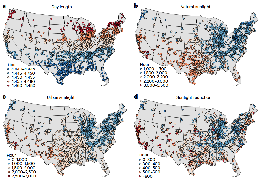 城市环境中的阳光是地理位置(如纬度和经度)、日期、天气状况和城市结构共同作用的结果(图1)。我们估算了2020年美国1,353个城市中,位于城市建筑区域内的年度阳光时数,这些区域包括被建筑物、道路和其他基础设施密集覆盖的人类居住地,通过结合地理编码参考系统(TIGER)城市边界和欧洲空间局(ESA)WorldCover “建筑”土地覆盖层的交集来进行界定(图2)。我们将阳光分为三类:总可能阳光(白昼时长)、没有城市遮挡的实际阳光(自然阳光)以及考虑建筑遮挡效应后城市环境中获得的阳光(城市阳光)。分析结果表明,与常识一致,全球范围内存在显著的纬度和季节性差异。这些城市的平均白昼时长为4,452小时(标准差为±7小时),高纬度城市每年比低纬度城市多出15到40小时的日照(图2a)。