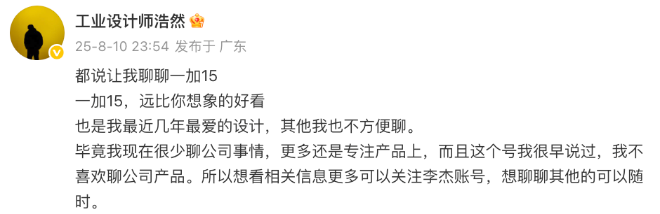 最近一加工业设计师浩然最近在微博超前预热,称「一加15,远比你想象的好看,也是我最近几年最爱的设计,其他我也不方便聊。」