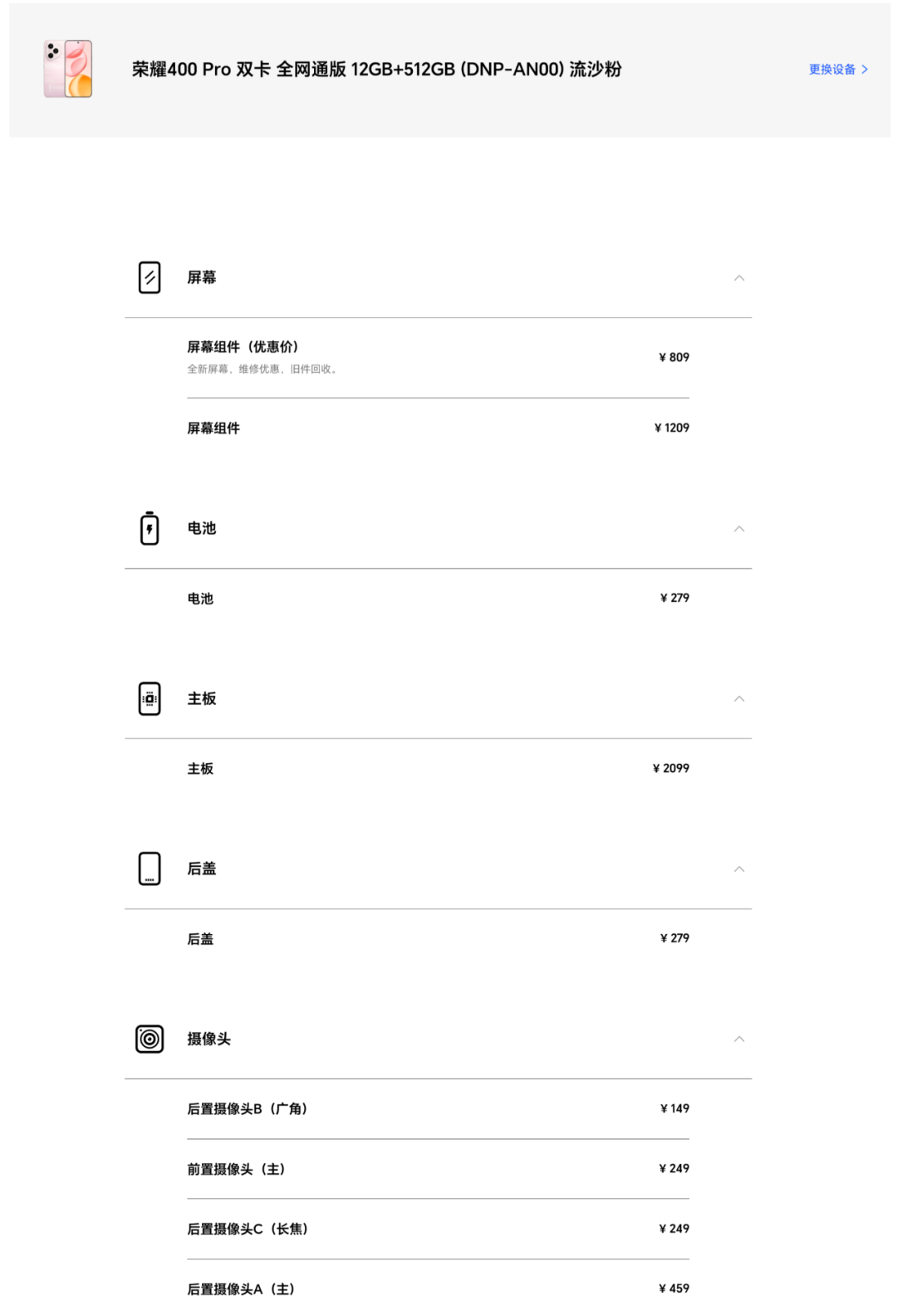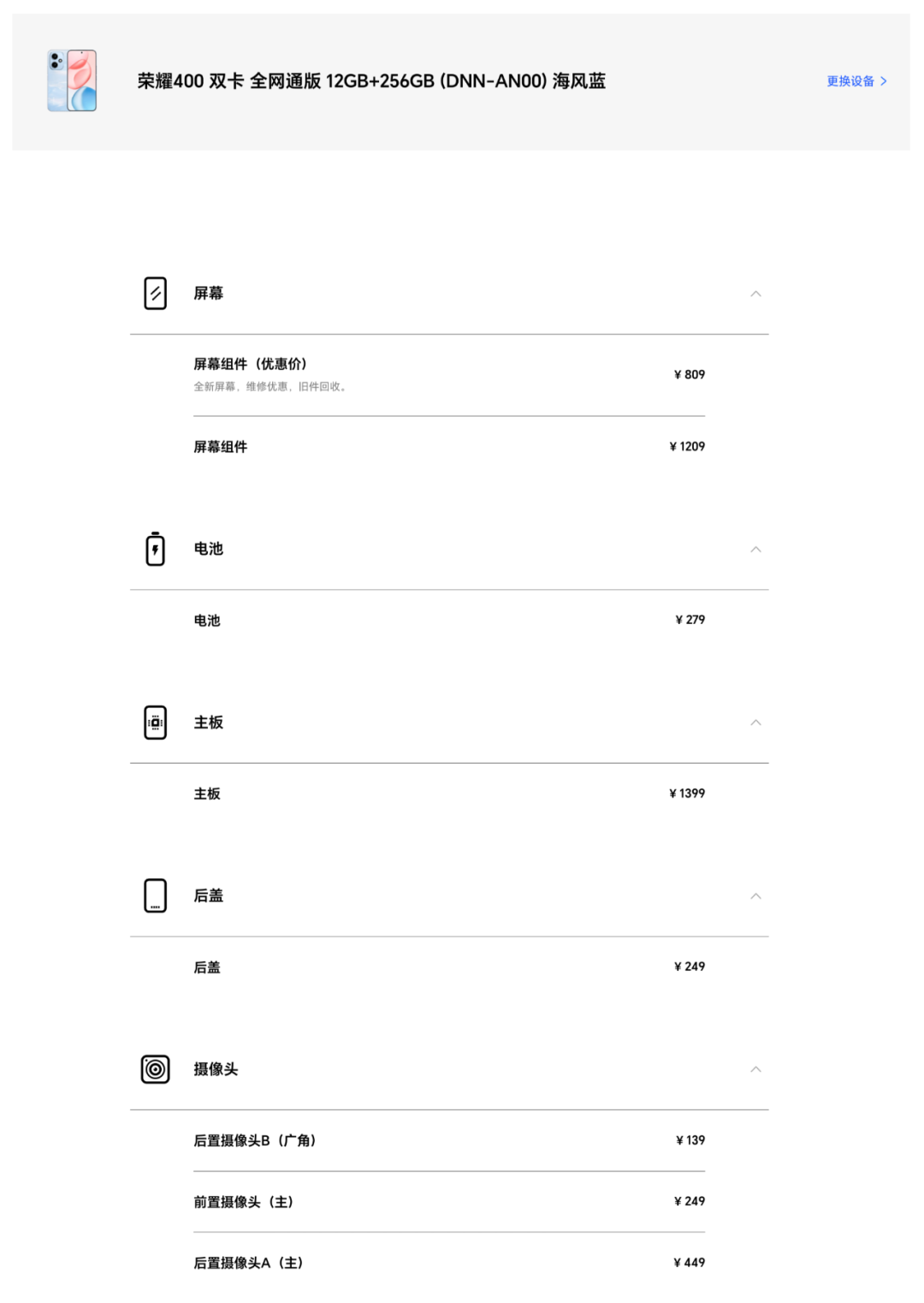 维修价格上,首先是荣耀400:保外维修时屏幕组件809元(优惠价)/1209元,电池279元,主板1399-1899元(不同存储版本主板价格不同),后盖249元,前置镜头249元,后置主摄449元,后置超广角镜头139元。