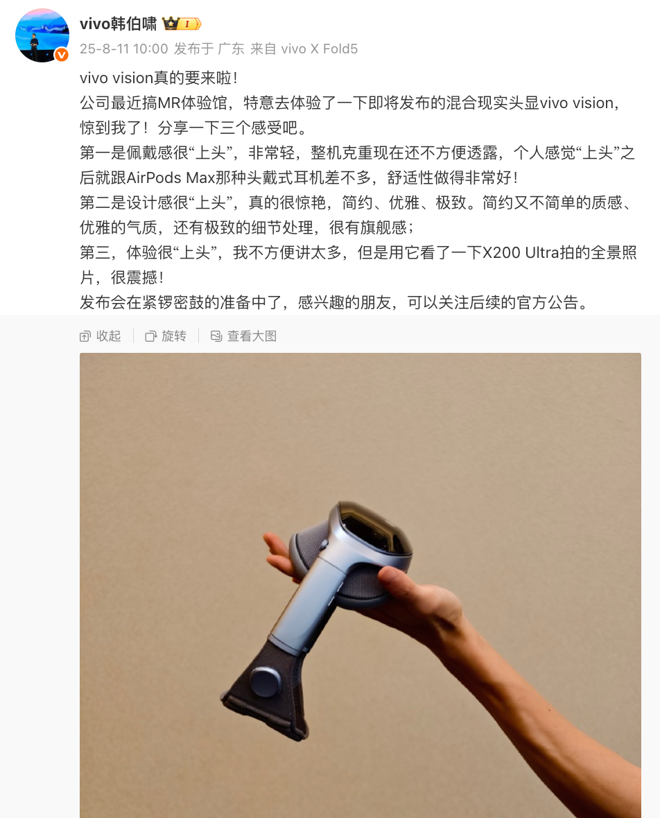 佩戴感很“上头”,非常轻,整机克重现在还不方便透露,个人感觉“上头”之后就跟AirPods Max那种头戴式耳机差不多,舒适性做得非常好!②设计感很“上头”,真的很惊艳,简约、优雅、极致。简约又不简单的质感、优雅的气质,还有极致的细节处理,很有旗舰感;③体验很“上头”,不方便讲太多,用它看X200 Ultra拍的全景照片很震撼!」并称:发布会在紧锣密鼓的准备中了。