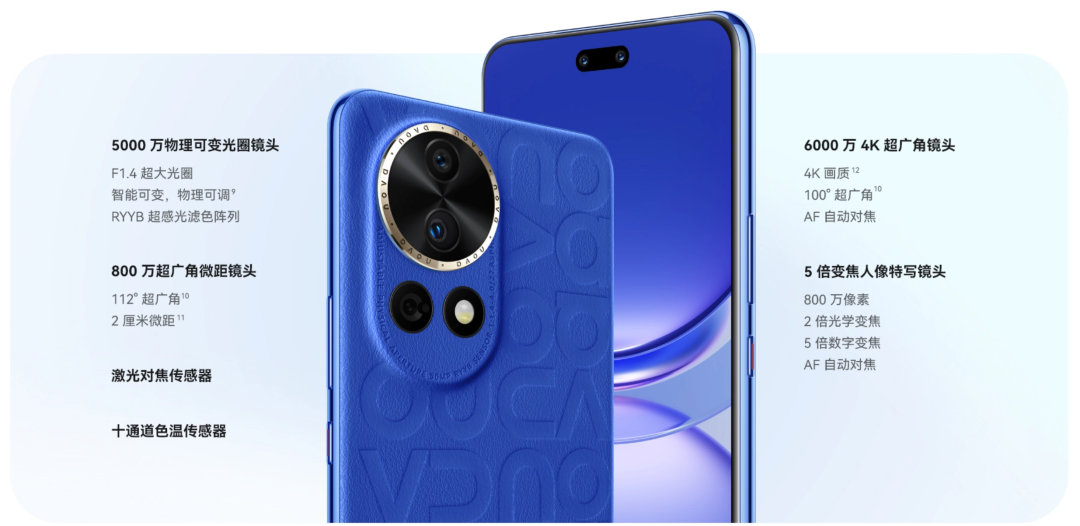 核心配置上,nova 12 Ultra前置双摄60MP超广角追焦镜头+8MP人像特写镜头,后置双摄①50MP RYYB主摄 F1.4-F4.0物理可变光圈 ②8MP超广角微距,内置4600mAh电池,100W有线充电,支持NFC、双频GPS,运行鸿蒙4,支持鸿蒙智慧通信,卫星通信双向北斗消息,隔空手势等。(第三方软件显示搭载麒麟9000SL处理器)