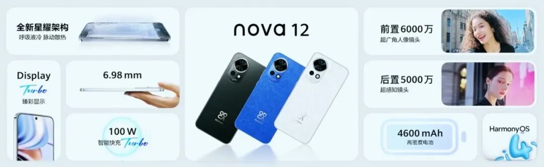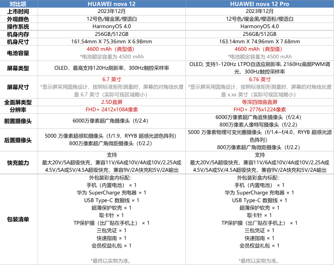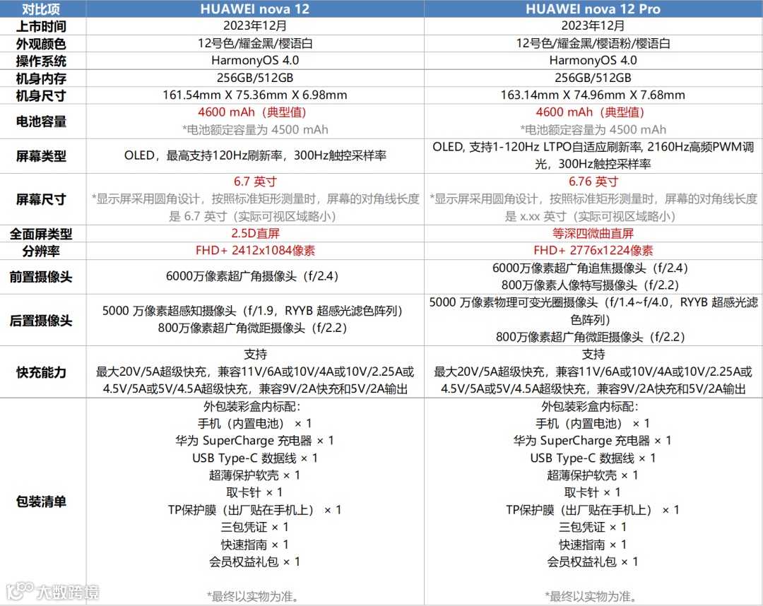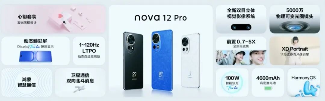 【华为nova 12 Pro】nova 12 Ultra同款1.5K等深四微曲屏、影像系统、快充电池方案,同样支持鸿蒙智慧通信、双向北斗卫星消息等,不过没有昆仑玻璃,而且提供的4个配色:12号色、曜金黑、樱语白、樱语粉都是玻璃后盖,具体机身厚约7.68mm,重约201g。(第三方软件显示搭载麒麟8000处理器)
