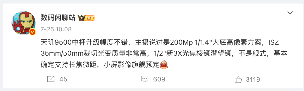 爆料达人数码闲聊站暗示:vivo X300升级幅度不错,主摄是200MP 1/1.4''大底高像素方案,ISZ 35mm/50mm裁切光变质量非常高,1/2"新3X光焦棱镜潜望长焦镜头,不是舰式,基本确定支持长焦微距,小屏影像旗舰预定。