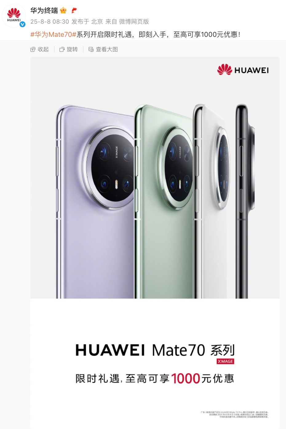 如上图所见,华为官方宣布Mate 70系列降价,最高直降1000元。