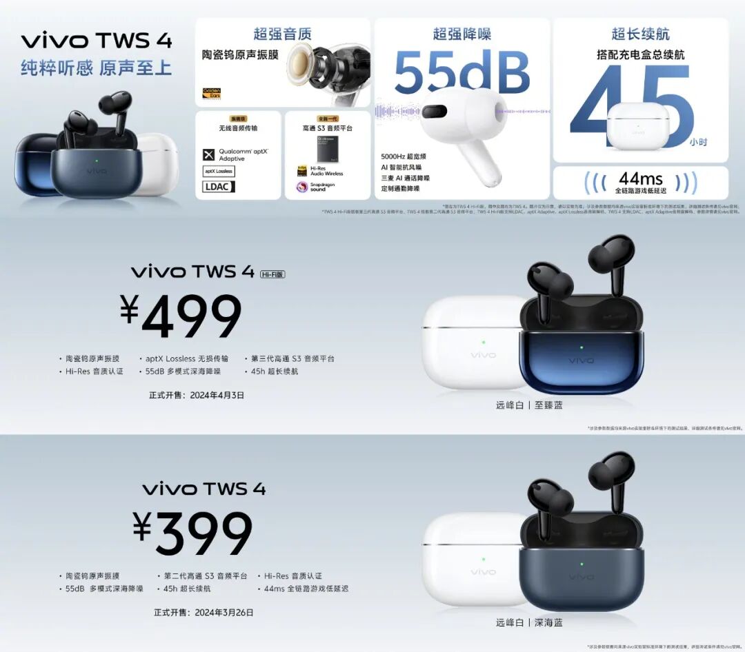 首先是vivo TWS 4,官方称行业首创「陶瓷钨原声振膜」,55dB深海降噪,45小时超长续航,最终vivo TWS 4售价399元,目前已开售;而vivo TWS 4 Hi-Fi版售价499元,全球首发第三代高通S3音频平台,搭载aptX Lossless无损音频传输,将于4月3日开售。