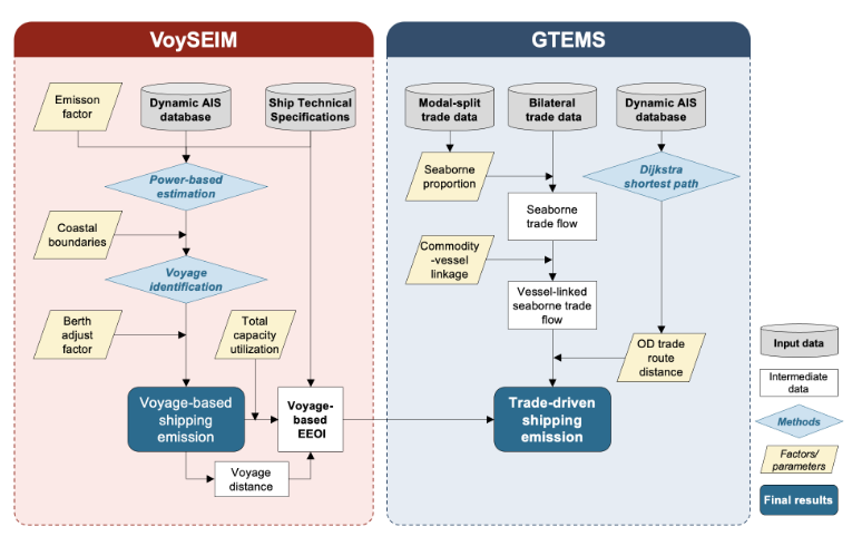 本研究构建了VoySEIM–GTEMS模型链,系统研究2018年全球海上贸易中双边对和商品的贸易关联航运排放和效率。VoySEIM扩展了先前的船舶排放清单模型(SEIM),增加航程识别方法估算排放和能效操作指标(EEOI)。因观察航程不完全对应贸易出口,我们开发GTEMS模型,将贸易流数据与航程基础EEOI结合,估算贸易关联排放。