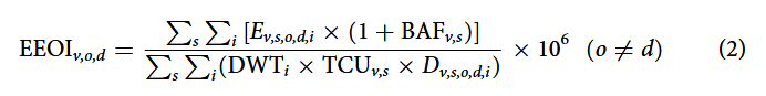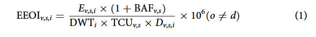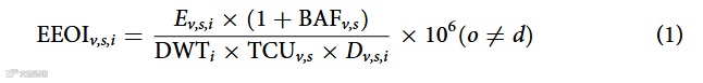 其中,EEOIv,s,i是按船舶类型和尺寸分类的每个航程的能效操作指标,单位为gCO2 ton−1 NM−1;Ev,s,i是航程CO2排放量,单位为吨;BAFv,s是停泊调整因子,无单位;DWTi是航程船舶载重吨,单位为吨;TCUv,s是总容量利用率,无单位;Dv,s,i是航程距离,单位为NM。