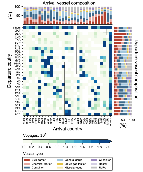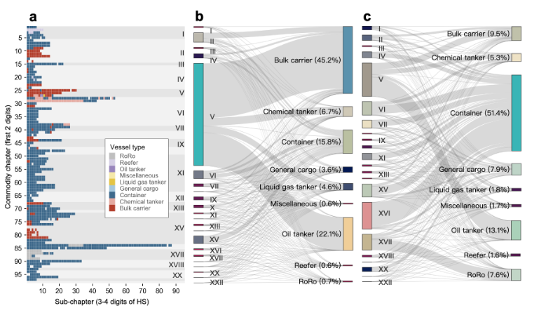 模型使用商业船舶数据和公开贸易数据构建。船舶数据包括2018年全年AIS数据(310亿条信号)和船舶技术规格数据库(STSD),排除邮轮和渔船。贸易数据来自CEPII的BACI数据库,涵盖200多个国家的5000多种商品,按HS编码组织。商品在HS四位码水平上合并,海上贸易不显著的国家纳入“其他”类别。预处理后,BACI数据包含120万条贸易流,涉及2451条双边流和1200多种商品。为估算海运贸易比例,还收集了联合国Comtrade数据库、Eurostat数据库和美国人口普查局的分运输方式贸易数据。